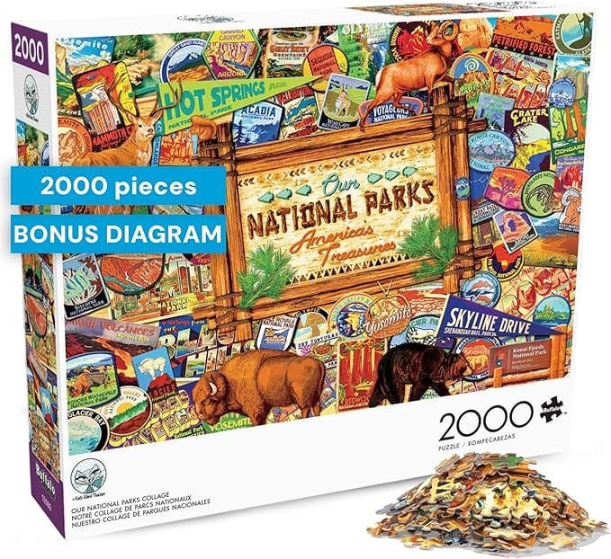 Buffalo Games has quietly become one of the most trusted names in the American puzzle market, and for good reason: they consistently deliver high-quality puzzles at a price that makes the hobby genuinely accessible. Their 2,000-piece puzzles are complete at 38.5″ x 26.5″ and are made from thick, premium recycled paperboard — a sustainability credential that comes without any compromise in durability. What really sets Buffalo Games apart at this price range is their proprietary Perfect Snap technology, which gives each interlocking piece a firm, confident fit that holds sections together without feeling stiff or forced. As our team sorted through their National Parks Collage puzzle, we were struck by how vivid and precisely printed the image was — each park scene rendered with crisp detail that made even the trickier sky sections manageable. A full-color bonus poster is included with every puzzle, functioning as either a helpful reference guide or a hidden-object checklist depending on the edition. This dual-purpose feature is a thoughtful touch that genuinely changes how you interact with the puzzle. If you want to build a serious puzzle collection without spending a fortune on every box, Buffalo Games is the smartest starting point — and probably where you will keep returning.