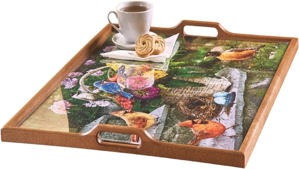 Serving tray showcases your completed jigsaw puzzles by using any 18″ x 24″ puzzle as the base.