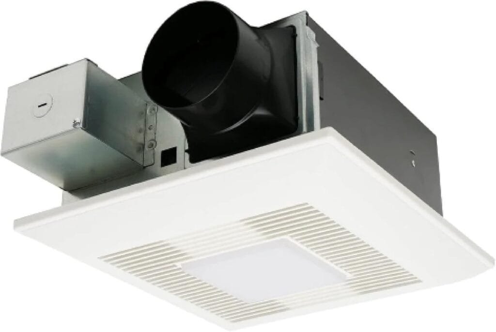All in one bath fan combines exhaust, light, and heater, delivering 80 CFM airflow at 1.5 sones.