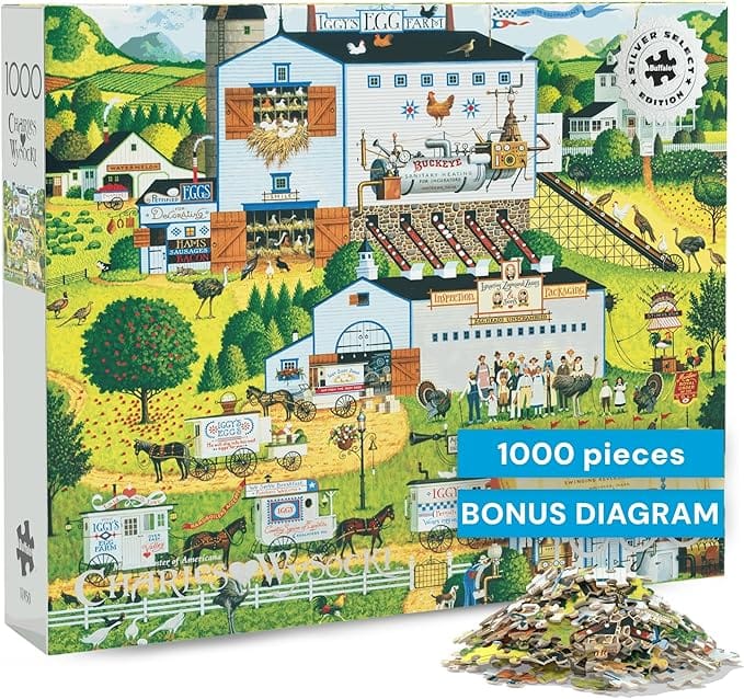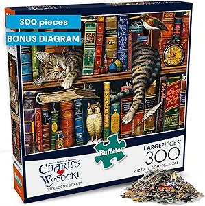 For anyone who wants a satisfying puzzle session without committing to an entire weekend, the Buffalo Games 300-piece Large Piece Jigsaw Puzzle is genuinely one of the more thoughtful options in this category. What distinguishes it from standard 300-piece puzzles is a detail Buffalo doesn’t always shout about: these pieces are approximately 33% larger than standard puzzle pieces. When our team first opened the box, that difference was immediately noticeable — each piece has a real physical presence, easy to pick up and manipulate without the fiddly frustration that can make smaller pieces feel more tedious than fun. This format was designed with older adults and those with reduced dexterity in mind, but honestly, it works just as well for a family evening where the youngest puzzler at the table is still building confidence. Themes in the 300 Large range include warm, story-rich images from artists like Charles Wysocki, whose folk-art scenes of cozy towns and seasonal moments feel right at home on a kitchen table in the early evening. The Perfect Snap™ fit keeps pieces from popping apart mid-session, and the included reference poster means less time squinting at the box lid. It’s a low-pressure, genuinely enjoyable format — one that tends to leave people feeling accomplished rather than exhausted.