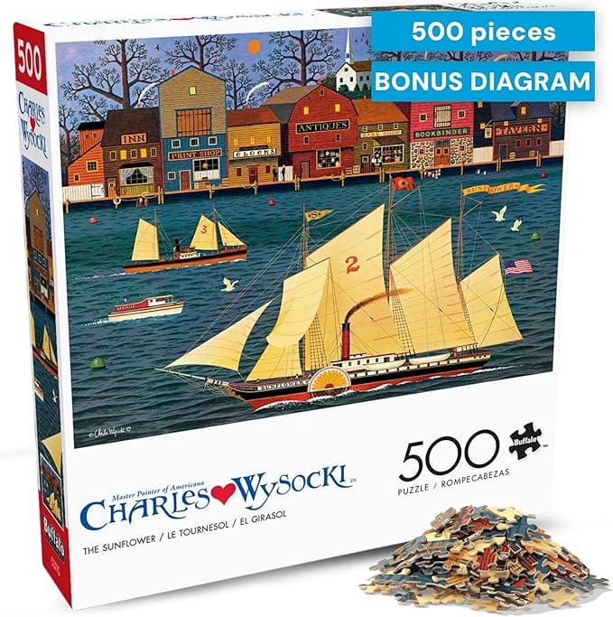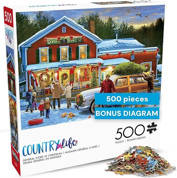 The Buffalo Games 500-piece Jigsaw Puzzle sits in a sweet spot that doesn’t always get enough credit — challenging enough to hold your attention across a full evening, but not so demanding that it becomes a multi-week commitment. Our team has come back to this format repeatedly because it hits a particular balance: you can pull it out after dinner, make real, visible progress, and come back the next night to finish without losing momentum. The 500-piece range in Buffalo’s catalog covers some of their most visually rich imagery — think detailed country life scenes, vibrant seasonal landscapes, and licensed collections that bring a pop-culture energy to puzzle night. The pieces themselves are standard-sized and use that signature grid-cut system, which we’ve found genuinely helps when you’re working through a dense background — sorting by shape becomes a more useful strategy than it is with random-cut puzzles. Finished size tends to come in around 18 × 21 inches, which fits comfortably on most dining or card tables without requiring you to clear out an entire room. One tester noted that the color printing on a Country Life: General Store at Christmas 500-piece was noticeably crisp and warm — the kind of image that makes you slow down and actually look at the finished product rather than immediately breaking it apart. The included poster, as always, earns its keep.
