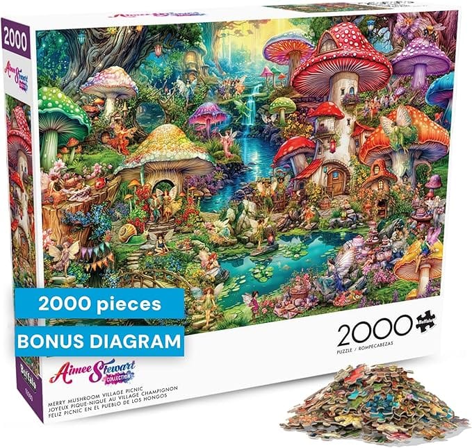 For the puzzler who considers 1,000 pieces a warm-up, the Buffalo Games 2000-piece Jigsaw Puzzle is where things get genuinely serious — and genuinely rewarding. Our team tends to reserve these for long weekends or the kind of January stretch where the outside world offers little competition. The 2000-piece format finishes at an impressive 38.5 × 26.5 inches, which means you’ll need a dedicated surface — a folding puzzle board, a large puzzle table, or a proper puzzle mat. What surprised our testers the most was how well the board quality holds up at this scale: pieces don’t fray or warp noticeably over the multi-week sessions these puzzles often require, and the Perfect Snap™ connection remains firm enough that you can work in sections without the completed areas shifting. The Aimee Stewart The Grand Fiction Library 2000-piece was one we spent considerable time with — Stewart’s whimsical, densely illustrated style means there’s always something new to notice in a corner you thought you’d finished, which keeps the experience engaging rather than monotonous. The reference poster is practically essential at this piece count, and we found ourselves pinning it up on the wall next to the puzzle table rather than leaving it flat. Buffalo also offers a Puzzle Express subscription at this piece count, which delivers a new 2000-piece puzzle monthly — worth considering if this format becomes a regular part of your routine.