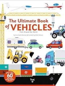 This oversized vehicle book features almost 100 cars, planes, submarines, and fire trucks for kids.