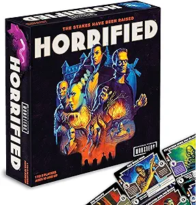 Horrified might be the best argument that horror board games don’t have to be inaccessible. It uses the Universal Monsters — Dracula, the Wolfman, Frankenstein’s Monster, the Mummy, and others — as the basis for a cooperative game where players work together to defeat a rotating cast of monsters before they terrorize the village to zero. What struck us immediately was how quickly the game teaches itself. Within fifteen minutes of opening the box, everyone at our table — including players who hadn’t touched a board game in years — understood what they were supposed to be doing and why. The monster AI is elegant: each creature has its own movement logic and defeat condition, which means the game genuinely varies based on which monsters you’re fighting. Defeating Dracula requires a completely different approach than containing the Creature from the Black Lagoon. The art direction leans into classic Hollywood monster movie aesthetics in a way that feels affectionate rather than campy. Component quality is above average for this price range. For families, game nights with mixed experience levels, or anyone who wants a solid introduction to cooperative horror gaming, Horrified earns its place at the table without demanding too much.