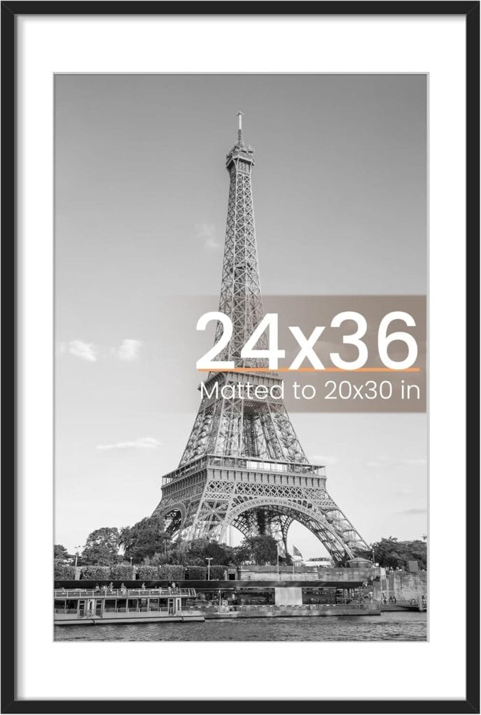 Dual-size design fits 24×36 posters or 20×30 prints with a mat, with a 0.5-inch trimmed display area for stability.
