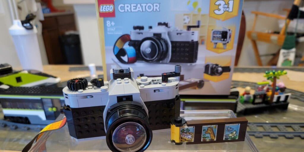 The Retro Camera set immediately caught our attention with its distinctive aesthetic. This detailed recreation of a vintage camera features a working zoom mechanism in the lens, a removable film canister that opens to reveal a miniature photograph, and a realistic texture created through expert piece selection. At approximately eight inches wide when built, it commands attention on any shelf or desk.