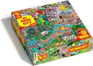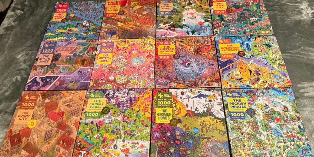 Big Rock City was the Magic Puzzle Company’s first new puzzle since 2022, and the excitement around its release was palpable — and, we’re glad to report, entirely justified. Set in a sprawling urban landscape that blends contemporary city energy with a fantastical, slightly retro-futurist aesthetic, the artwork is dense, layered, and enormously fun to explore. Our team immediately started arguing about which building to tackle first, which is exactly the kind of productive chaos a great collaborative puzzle should generate. The 50+ Easter eggs here feel especially well-hidden — we were still finding new ones on our third look at the finished image. The Magic Shift® mechanism in Big Rock City is described by the company as their most ambitious yet, and after experiencing it, we’d agree. If you’ve been away from Magic Puzzles for a while, or if you’re ready to graduate from the original series and want something that pushes the format forward, Big Rock City is the one to pick up.