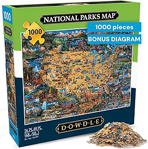 Explore a 1000-piece USA map puzzle filled with landmarks, wildlife, and park scenes.