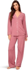 Eberjey pajamas have a reputation that precedes them, and after testing them, we understand why they’ve maintained a loyal following. The Gisele set is made from a modal-jersey blend that’s softer than most T-shirt fabrics — it has a slight drape to it that feels elevated without being precious. The fit is relaxed but not shapeless, and the stitching quality has held up through repeated washing without pilling or stretching. Our tester said she found herself putting them on earlier and earlier in the evening. They’re an investment for pajamas, without question — but for a mom who’s been wearing the same stretched-out cotton set for three years, this upgrade lands with real impact.